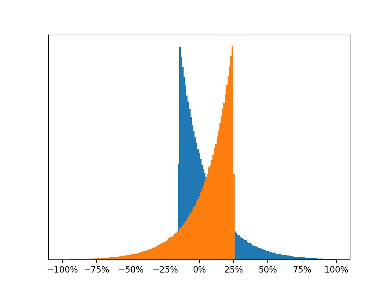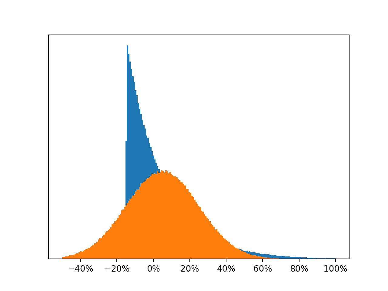 These distributions have the same standard deviation. But the blue distribution is still preferable to the orange one, because the orange one has a much bigger risk of losing money. It’s symmetric, whereas the blue distribution is right-skewed. Just looking at standard deviation doesn’t capture that.