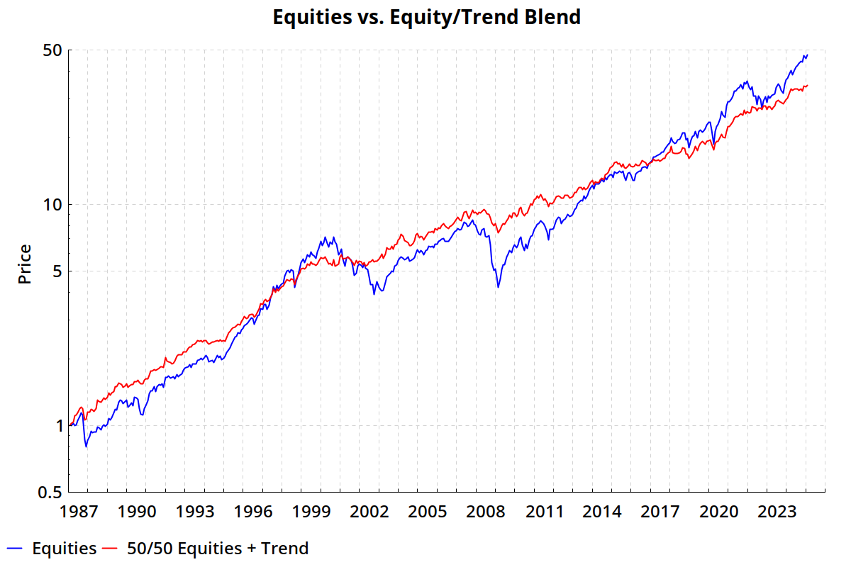 The trend index did not perform as well as US equities, but a 50/50 combination gave a better risk-adjusted return than either strategy alone.