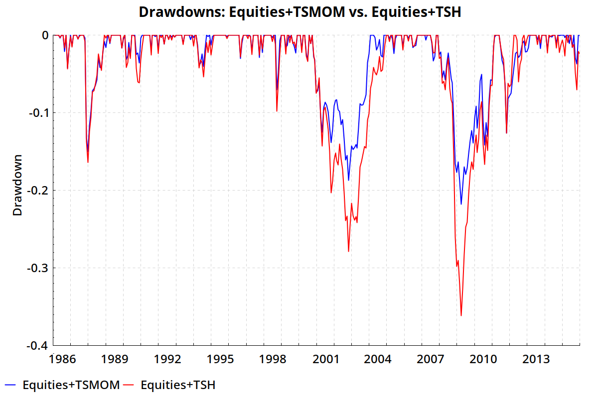 In isolation, TSMOM had more downside risk than TSH. But it looks much better as an addition to an equity portfolio: