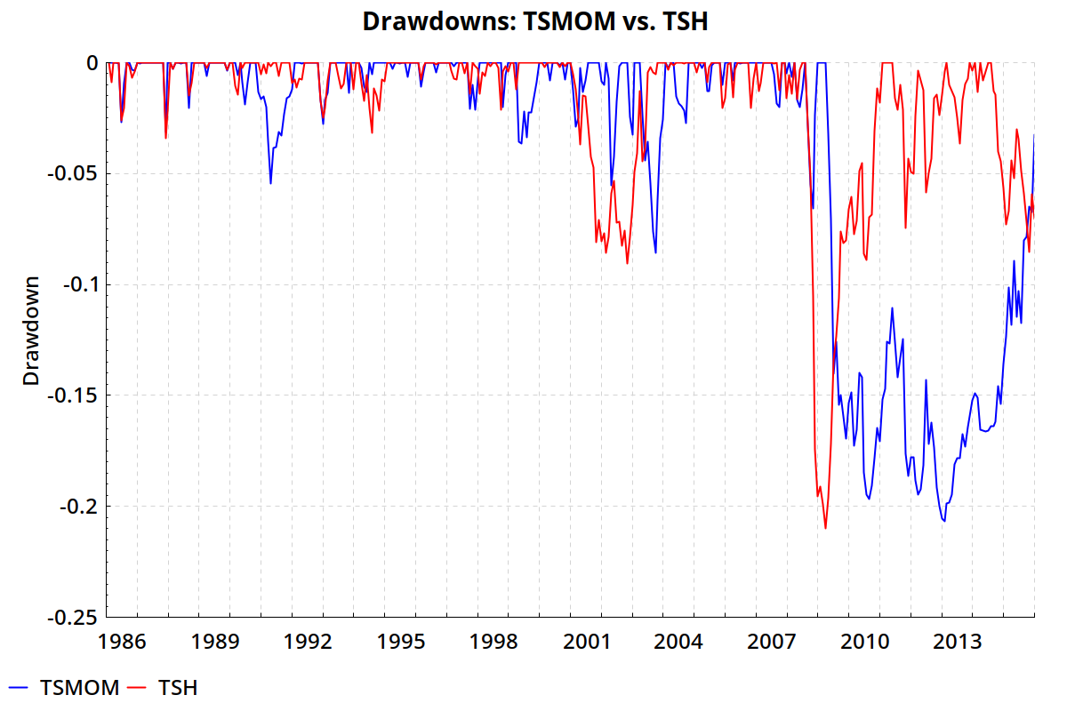 If we compare the historical drawdowns for TSMOM and TSH, TSMOM looks more painful to hold: