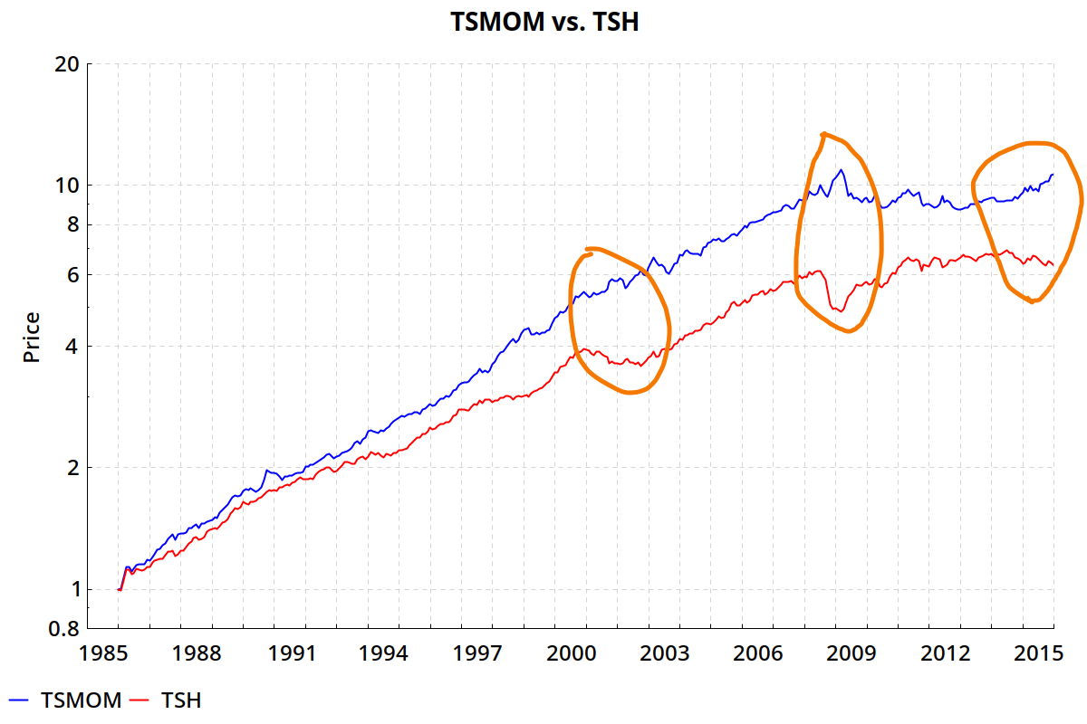 As a first look at TSMOM vs. TSH, here’s a chart of their total returns 1986–2015. Notice the divergence in the circled areas: