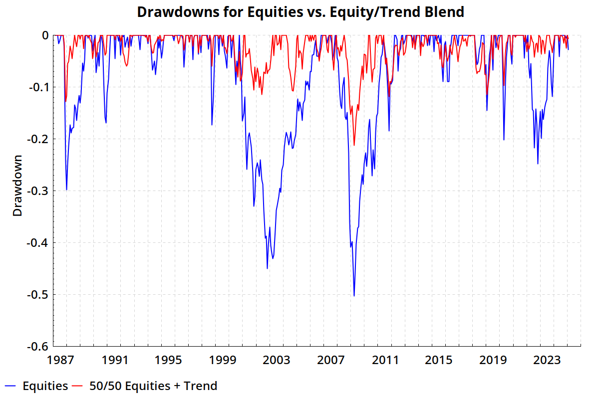 I used the SG Trend Index from 1999 to 2024. The SG Trend Index did not exist prior to 1999, so for the earlier period I used the BTOP50 Index. BTOP50 is less representative because some of its constituent funds pursue other strategies in addition to trendfollowing. To my knowledge, BTOP50 is still primarily trendfollowing-focused, even if not exclusively so. ↩ ↩2